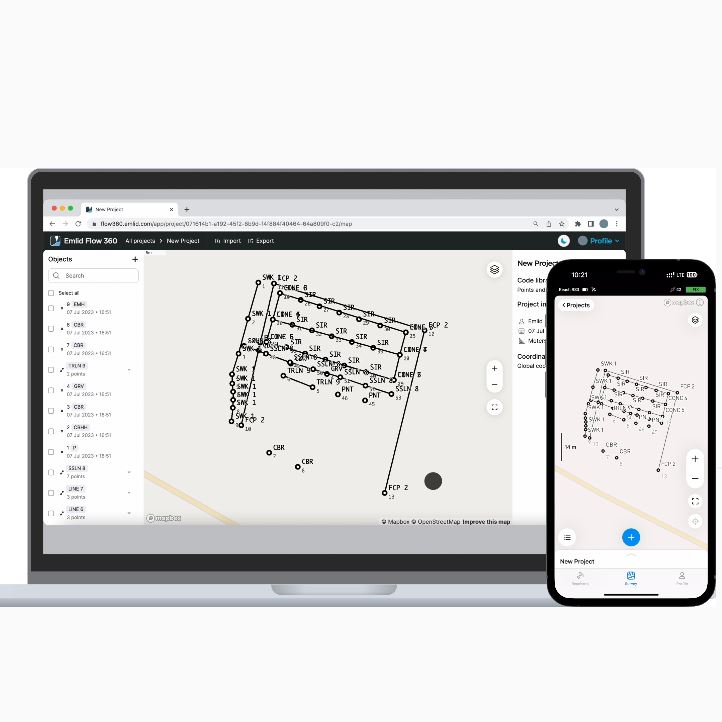 Emlid Flow lets you work with CAD files and DTMs, collect and stake out points, calculate geometry, and ensure structures are positioned exactly to plan. With cloud-based Emlid Flow 360, your field and office always stay in sync.